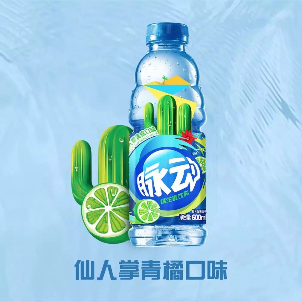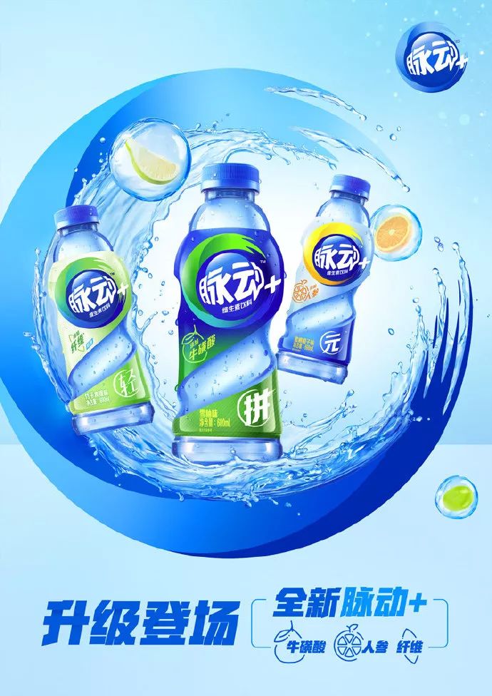 但是值得學習的地方是我們看到脈動一直在強化自己魚眼的LOGO視覺標簽,這個是很難能可貴的,從新LOGO的改變中我們就看到,這個魚眼圍繞的水圈被作為自己品牌的超級符號應用于其產品本身的海報及包裝上,且顏色根據產品的口味進行漸變式的改變,真的還是蠻占據市場心智的哈!